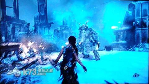 走过一条长长的隧道再过一座桥后发生剧情。完后往前走看见一个大铁块往中间拉,风会把它吹向门把门敲碎,继续往前爬上一座冰山发生剧情。干掉几个杂兵后那个巨型武士再次出现,这次需要干掉他。只能攻击他背后才有效几枪后过去按三角,然后边上有弓箭手会出现,(建议先清理弓箭手)继续打他后边几枪后再过去按△可以把他头盔打掉,然后攻击后背头部都可以,最后再过去△解决他。