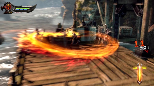 首先,历代玩家习惯用来抓敌人或终结敌人的按键从一直以来都负责这个任务的O钮被改成了 R1 钮。塬本只会徒手抓人的克雷多斯这回也活用了武器特性,让自己的抓技有效距离变成了过去的大约 3 倍之远!