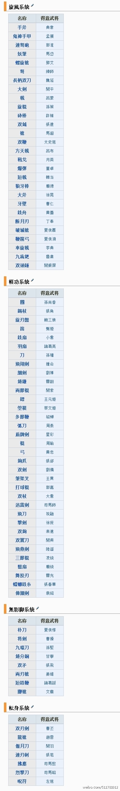 武器全77种,这次各武将的武器系统适性都分为旋风、轻功、无影脚、转身四种。适性分为4阶段,用星数表示。星数低则难以使用,星数最高时则可发动特殊天禀技能。各武将的得意武器适性最终可上升到4星,其他适性则不行。