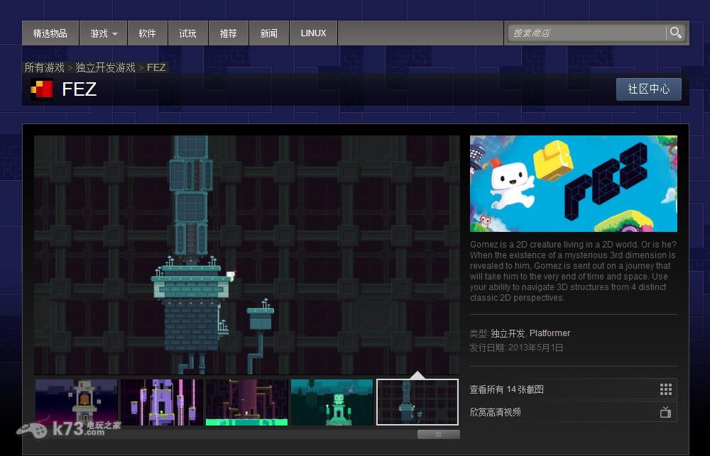 《Fez/菲斯》是由Polytron公司于20102年4月发售在Xbox LIVE上的一款解谜类经典游戏,这款游戏虽然画面不算精美,但是游戏内容却极为丰富。官方于近日宣布游戏将会在5月1日登录Steam平台,游戏的发行交由Trapdoor。