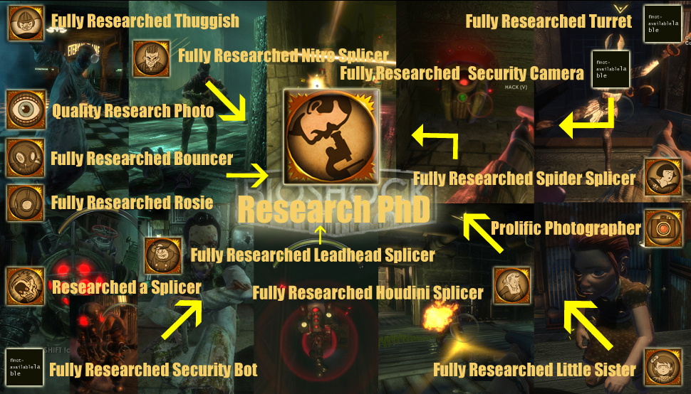 | Research PhD →(Fully Researched Thuggish Splicer+ Fully Researched Leadhead Splicer+ Fully Researched Spider Splicer+ Fully Researched Little Sister + Fully Researched Houdini Splicer+ Fully Researched Nitro Splicer+ Fully Researched Bouncer+Fully Researched Rosie)→Prolific Photographer→Quality Research Photo→Researched a Splicer |