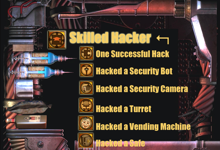 | ★小贴士:侵入这一类型的奖杯非常简单,除了每个能侵入的东西各侵入一次外,之后只要反复侵入次数达到50次即可,一般为了Skilled Hacker这个大头奖杯玩家得一见到能黑的东西就黑,这样一来各种可侵入物品的一次侵入奖杯也必定到手。 |