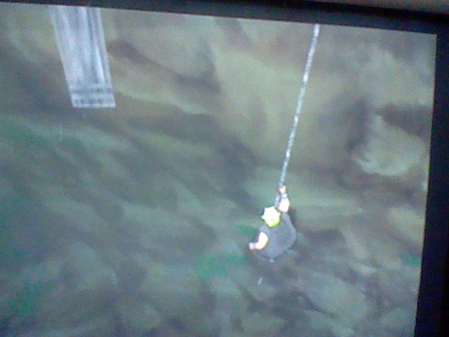 随着桥的坍塌,大叔只能靠一个绳子支撑他的身体,再这样他非掉下去不可。