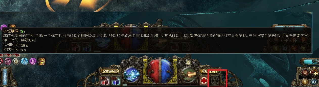 永恒旋涡技能说明:冻结同围的时间,创造一个你可以自由行动的时间泡泡,攻击、移动、使用法术会使时间泡泡缩小,其他行动,比如整理你的道具物品栏则不会减小,当泡泡完全消失时,世界将恢复正常!
