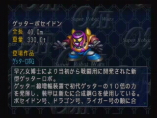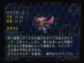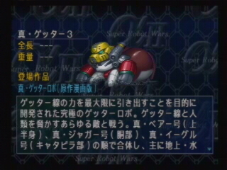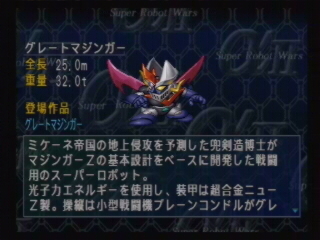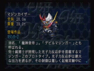 强化型魔神Z: 皇帝入手以后,魔神Z就自动强化了,主要是武装方面增加2发残弹的大车轮飞拳和1发残弹,ALL系的强化型飞拳。在攻击能力方面有明显提高。不过因为甲儿一般就上调去开皇帝,所以这台机体往往就留给了波士。在编队的时候机体也就沦为僚机了。要注意波士没有必中!再有,如果你想使用本游戏里面攻击力最高的合体技的话(7500,ALL系),就要在皇帝入手后,强迫甲儿继续开这个魔神Z,换了别人是不行的。 |