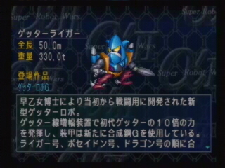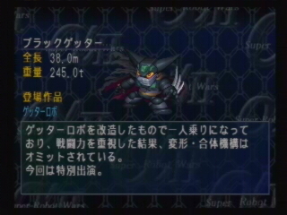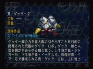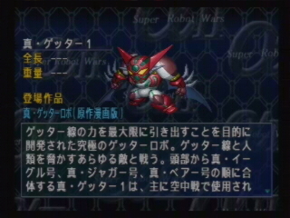 黑盖塔: 超级系早期登场的机体,能力基本上不错,带有分身,不过作为队长机的话实力不足。做僚机倒是不错的,PLA武器有1-5的射程,而且是PLA武器中少见的格斗型(可以给曾加做僚机)。可惜无论机体是否保留,在后期都很难上场,除非放弃盖塔G和真盖塔。强化芯片以装甲和EN系为主。武藏驾驶的时候要额外注意的一点就是武藏的空适应性是B! |