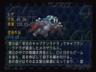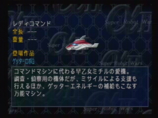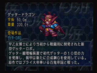 大魔神: 游戏初中期很实用的机体,攻击和防御能力都很出色,阳光雷是ALL系射击型长距离(射程6),无气力要求。格斗型的ALL系满改也有4000的攻击力,但是不能对宇。让铁也学个节能,再加上一个EN恢复的芯片,这台机体就是杂兵杀手。中期追加的GREAT BOOST对BOSS战也很强(满改6100,考虑到魔神力量的话,用“热血”就是“魂”的效果),特别是铁也有对米加帝国+20%伤害力的队长能力,在中后期对米加帝国的战斗中伤害力很高。推荐强化芯片以命中系和EN系为主。推荐僚机除了修理机维纳斯A以外,配一台电磁可以解决精神问题。 |