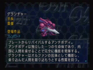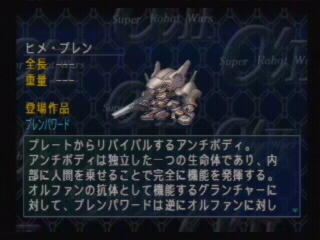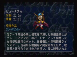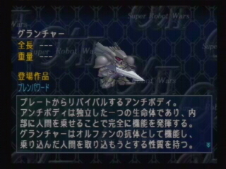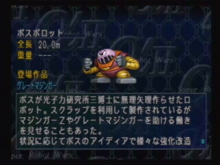 BOSS机器人: 拥有最强的单体(ALL系)武器的最差的机体!这台机体完全没有实用性,武器射程1,最强武器需要150的气力,且只有1发残弹,机体适应性除了陆S以外都是C,而且这台机体是所有机体里面唯一一台没有PLA支援武器的!也就是说这台机体除了能提供EN恢复以外,基本一无是处。曾加线的话还可以给古伦三式当僚机,其它路线的话很容易被放弃。但是考虑到后期BOSS有机会换强化型魔神Z甚至皇帝,所以要适当培养波士。要注意的是,另外两个辅助驾驶员精神不会增加。由于机体最终会被放弃,所以强化芯片以适应性和装甲系为主。 再补一句:这台机体的所有动画(包括防御,被攻击等)都是以搞笑为前提制作的。 |