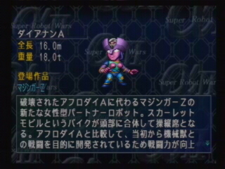 魔神Z: 在超级系路线很早就登场了,机体能力基本上除了装甲以外都比较普通,武器攻击力马马虎虎,还好有魔神能力的补正。由于后面的皇帝是继承这台机体的改造的,所以,在游戏初期就可以放手改造,50%左右的改造后,这台机体就能发挥肉盾的作用了。甲儿能力还可以,在游戏初期建议学一个援攻,战意高扬也比较有用,因为越早发动魔神能力越好。游戏初期,这台机体基本上还是队长机的,在僚机的搭配方面可以和古伦三式相似。强化芯片以命中率上升和装甲为主,射程增加的也可以考虑。 |
