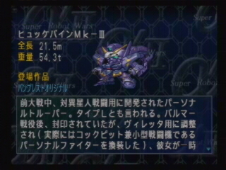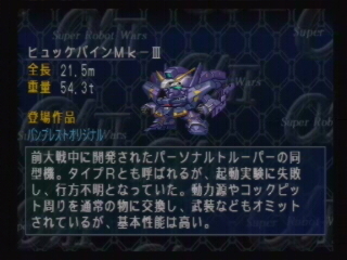 修克拜因MK-III(主人公机): 换装了普通的核融合引擎之后,完全没有ALPHA里面的风采。机体能力只能算中等,还不能空飞!机体有剑,但是主人公没有剑切能力!武器是以格斗为主,射击为辅。近程的光剑没有任何消耗,射程1-2;飞盘是最强技,EN消耗型,射程3-5。射击武器是残弹型,射程1-6,没有ALL武器!对这台机体的能力实在是很失望,就算是主人公的早期座机也未免太弱了吧。特别是相对超好用的龙人机,高威力的古伦加斯特三式而言,实在是没有什么突出的地方。男主人公的能力也平平,特别是很重要的回避能力比起NT系的要低20点左右,再加上没有什么NT,念动力之类的特技。0改机体的话,很容易被BOSS秒。推荐强化芯片是以运动和装甲系为主。僚机一定要有一台BP,其它基本随意。 |
