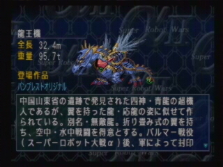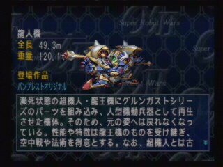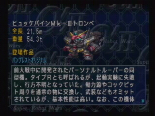 龙人机: 在所有原创机里面最实用的机体,机体空飞,移动6,武器射程长,武器消耗小,ALL系武器居然有6发残弹(基本打不光的),最强武器有3格射程,仅消耗50EN。楠叶有念动力,在超级系机组里面属于命中回避都很高的,再有楠叶有援功,在游戏初期打那些会跑的家伙的时候很有用。缺点,楠叶小队长能力很废,另外没有剑切能力!由于在2A里面,相当多的敌人都有导弹和体当系的武器,所以没有剑切的话比较吃亏。如果不给楠叶学剑切能力的话,就要对机体的运动性进行大量的改造。在僚机方面,能够空飞是基本要求,EN补给机基本上是不用的,能够提供加速精神的机体如BP,某些高达系机师驾驶的利卡兹或超级高达等。修理机不是特别需要,加上也可以。强化芯片以装甲和运动性为主。 |