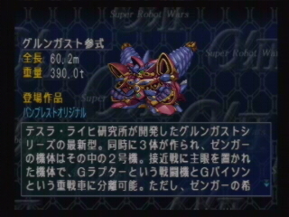 古伦加斯特三式: 优点HP,装甲都不错,斩舰刀的威力也很高(满改5800),ALL系的光线杀伤力也不错,中距离的飞拳没有任何消耗,曾加的格斗数值很高(初始的时候就比那些超级系的主力来得高!),剑切能力也不错。缺点是陆行,移动力低(5),EN消耗严重。针对这些问题,建议在小队中加入补给机----BOSS,修理机黛安娜A,最后一个名额留给蓝色的那台BP(机师有加速)。这个就能保持较高的持久战斗能力。推荐强化芯片以EN系和装甲系为主,射程加1的也可以考虑,僚机考虑增加移动力的芯片。 PS:R女最终机体的最强技+魂和这个斩舰刀+热血的伤害差不多,高威力就是高威力啊! |