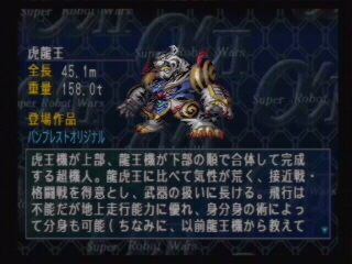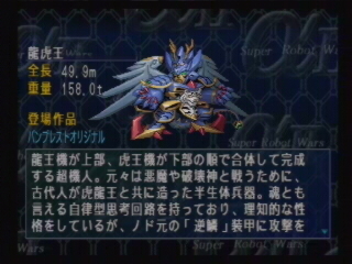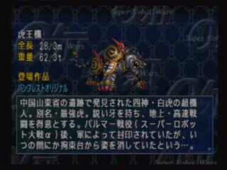 虎龙王: 优点是低消耗的攻击,移动后攻击力高,回避能力出色还有分身。缺点是武器适应性差!除了飞拳以外,其它武器的空,海适应都是C,陆S,宇A,所以全S的芯片(或全A)极为重要。另外虎龙王没有ALL武器,所以在实际使用的时候和大曾加很像。 |