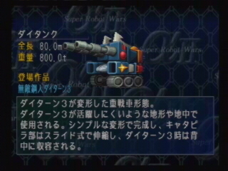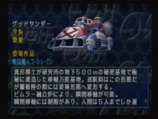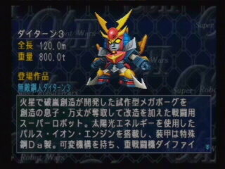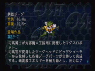战国魔神: 超级系里面少见的以远距离射击战为主的机体,机体能力普通,武器方面配置比较全面,真吾的队长特技是射程+1,而且命中能力在超级系里面是比较出色的,所以这台机体比较适合在二线放黑枪。最强武器在游戏后期会有一次强化,不但威力加大(满改6200),而且属性也变成ALL。不过考虑到这个武器多数是为了BOSS战用的,所以ALL属性不是太必要。机体还有一种普通的ALL属性武器是不能打近身(1-2)的,使用的时候需要注意。驾驶员三人组精神全面,基本上该有的都有了,学习的技能方面首推节能。机体的强化芯片主要推荐EN系,作僚机的时候,要考虑到移动力和体积。 |