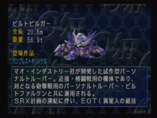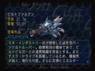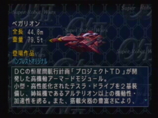 贝伽利昂(R女宿敌的机体): 37话加入,红色的飞机,不能变形,高运动性,有分身能力,移动力高,武器方面有MAP!残弹2发,属于自由选择爆炸范围的类型。其它武器都是射击型,消耗残弹的。 |