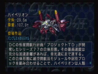 海佩利昂(合体机): AM的最强机体,MS形态,很有ALPHA里面MK-IIIGUNNER的风采!机体的各项能力都很高,有分身,加冬瓜后,移动力10!武器是两台机体的加成,所以种类繁多!MAP,ALL,P系中远距离等一应具全。机体有超巨大的光剑配备,是该机体唯一一种EN消耗型的武器(30EN),可惜我是无缘看到这把剑的剑切动画(高回避,有分身,很难看到),最强武器的威力有6000对于射击型武器来说够高了,而且战斗动画里面有三女的头像很好看的说。虽然在最终伤害能力方面是4个主人公里面最低的,但是这台机体的实用性是最高的。有机体的辅助,R女是最有希望和“屠夫”希罗争夺ACE的人了。 |