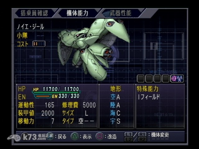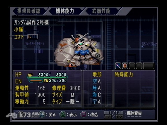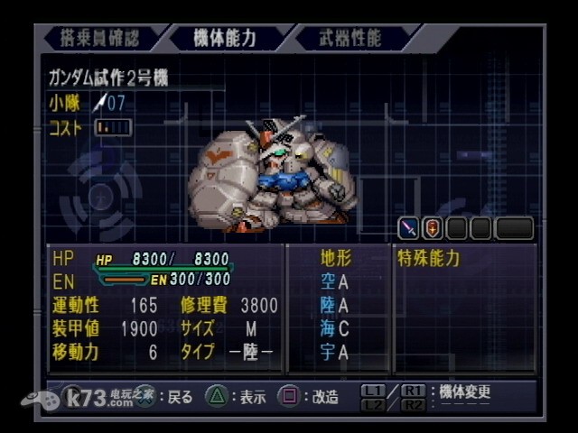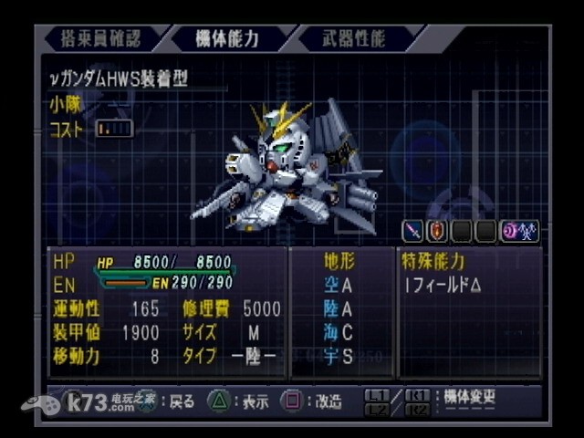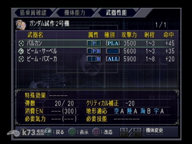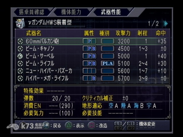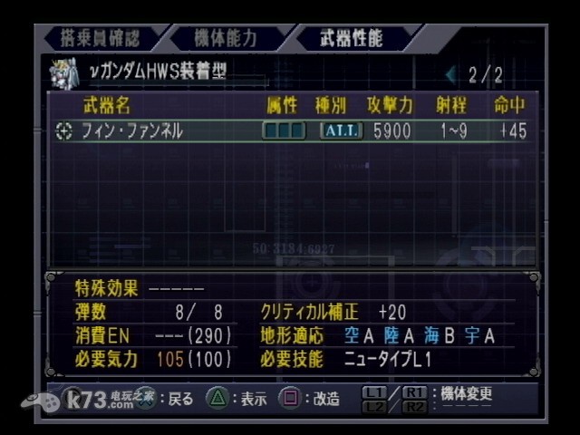 1、νガンダムHWS 情况1:37话开始时アムロ击坠数超过60入手。 情况2:44话后选择[宇宙で対ザフト戦にさせる],那么在45话[忍び寄る終焉]结束后,必定得到。 情况3:44话后选择其他3条路线,48话结束合流时必定得到。 机体能力 武器数据1  武器数据2