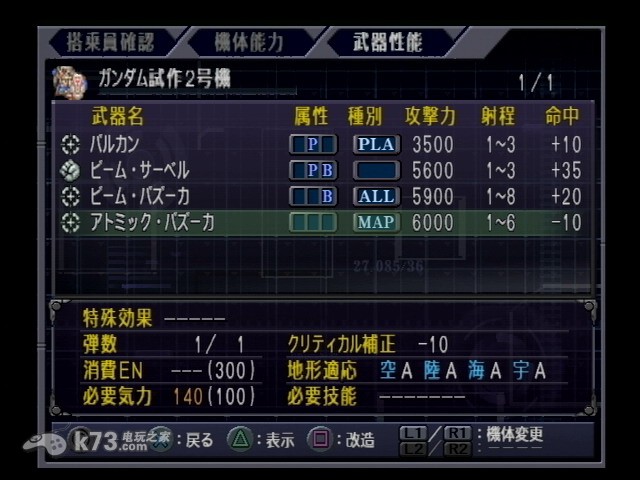 2、ガンダム试作2号机追加核弹装备:アトミックバズーカ[换装] 情况1:36话结束得到ガンダム试作2号机的情况下,53话开始前バニング、ベイト、モンシア、アデル的击坠数之和大于150,即可得到核弹换装。 情况2:36话未能得到ガンダム试作2号机,那么53话[出航!銀河殴り入み艦队!]开始前バニング、ベイト、モンシア、アデル的击坠数之和大于185,则ガンダム试作2号机和核弹换装一起得到。 机体能力  武器数据