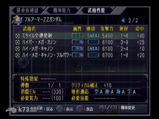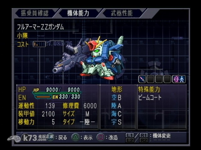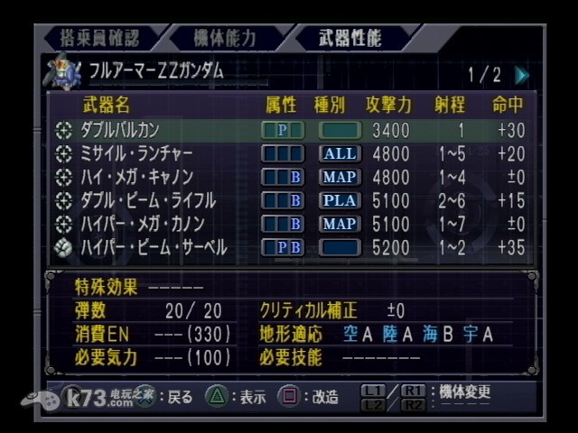 1、フルアーマーZZガンダム[换装] 情况1:44话后选择[宇宙で対ザフト戦にさせる],那么在45话[忍び寄る終焉]结束后ジュドー、ビーチャ、エル、モンド、イーノ击坠数之和超过125就可得到,如果45话后没能达到击坠数要求,则在53话开始时强制得到。 情况2:44话后选择其他3条路线,在53话[出航!銀河殴り入み艦队!]开始后强制得到。 机体能力  武器数据1  武器数据2