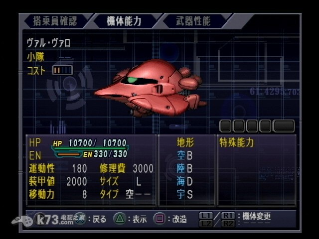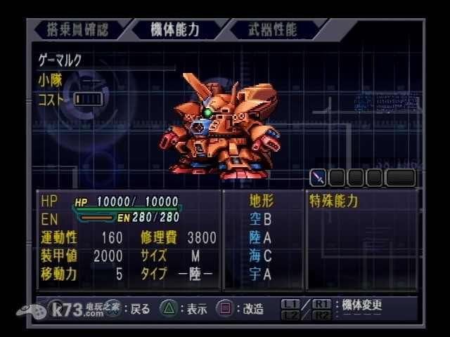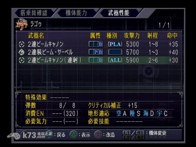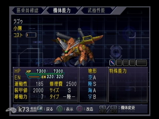 2、ラゴゥ 18话[银河流浪]结束后选择[地上部隊へ編成する]。 那么在21话[プリティ·デビル]前半战里バルトフェルド和ダコスタ生存并合计击坠敌人10机。 22话[砂塵の果て]用キラ击坠バルトフェルド。 44话后选择[宇宙で対ザフト戦にさせる],那么在45话[忍び寄る終焉]结束后或其他分支48话结束后得到。 机体能力  武器数据