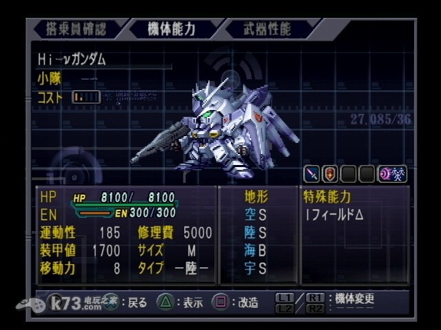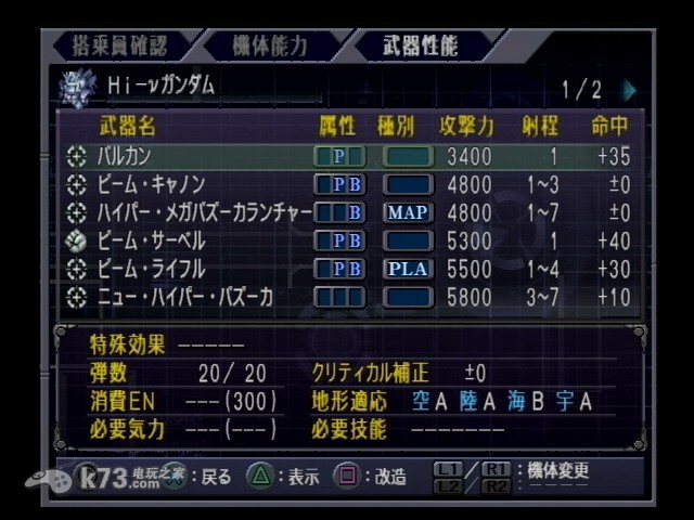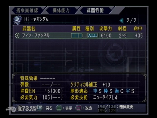 2、Hi-νガンダム 52话结束时アムロ和ブライト的击坠数之和超过120,那么53话 [出航!銀河殴り入み艦队!]开始时得到。 机体能力  武器数据1  武器数据2