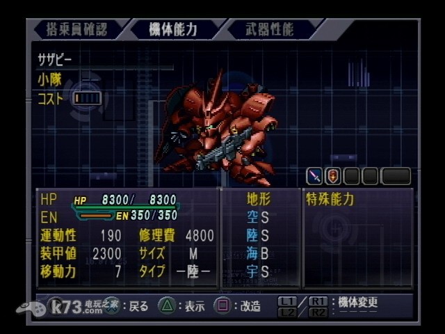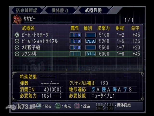3、サザビー 52话结束时アムロ和カミーユ的击坠数合计50以上,那么53话 [出航!銀河殴り入み艦队!]开始时得到。 机体能力  武器数据