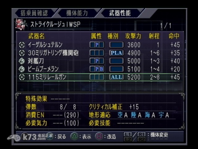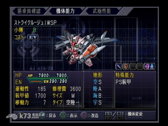 1、ストライクルージュIWSP[换装](注2) 29话[押された烙印]结束时前カガリ击坠数超过30,结束后分支选择[地球に归還させる]。 30话[終わらない閃光]用キラ(SEED)击坠アスラン(SEED)、ムウ击坠ディアッカ。 45话[忍び寄る終焉]结束后カガリ、ジュリ、マユラ、アサギ4人的击坠数合计100以上时得到。 如45话不走种子路线,则53话开始前得到。 机体能力  武器数据
