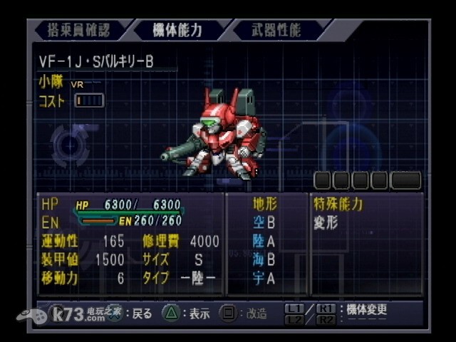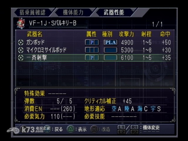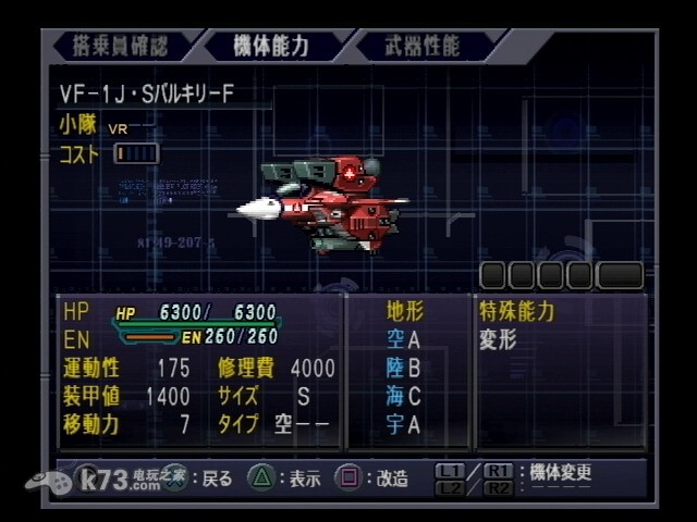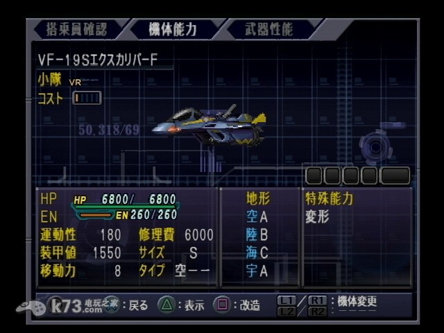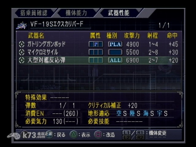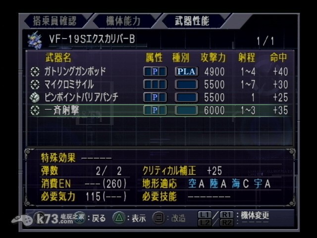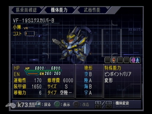 3、VF-19エクスカリバー(三机) 情况1:44话结束后选择[バロータ星系へ向かわせる],在46话 [野望の第4惑星]第2部分逃脱里,マックス击破敌人15机以上,那么,47话[大宇宙の意志]开始后得到。 情况2:44话后选择其他3条路线,48话合流后マックス击坠数超过60入手(注:マックス在45后离队,48话合流时击坠数+3,所以实际上需要在45结束前击坠数超过57)。 机体能力1  机体能力2  武器数据1  武器数据2