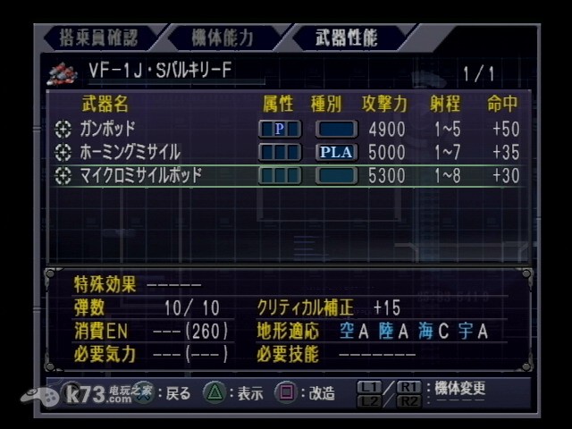 1、VF-1J·S(ミリア收藏珍品机) 18话[銀河流浪]结束后选择[地上部队へ編成する],那么在21话[プリティ·デビル]ミリア生存且击坠数超过30,过版后得到。 机体能力1  机体能力2  武器数据1  武器数据2