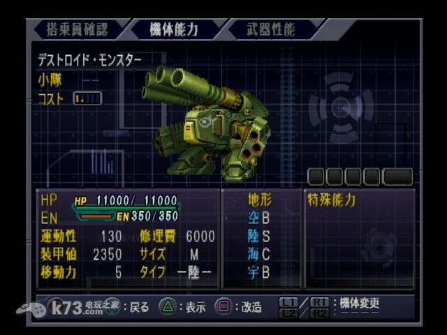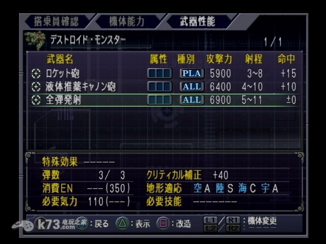 2、デストロイドモンスター 情况1:29话后选择[他の星系へ向かれせる],并在31话得到熟练度,过版后得到。 情况2:29话选择[地球に帰還させる],如52话结束时,骷髅小队(辉,福卡,柿奇)的击坠数超过100,在53话[出航!銀河殴り入み艦队!]开始时得到。 机体能力  武器数据
