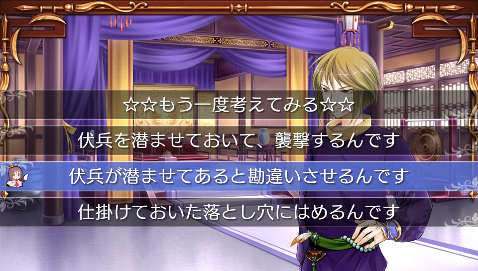军议画面,这边会有角色问题出战时的应对方法等等,玩家就要选择回答,有些问题需要思考过不会答错,就算玩家不知道要怎麼选也可以把提示开出来.. 很贴心的设计。