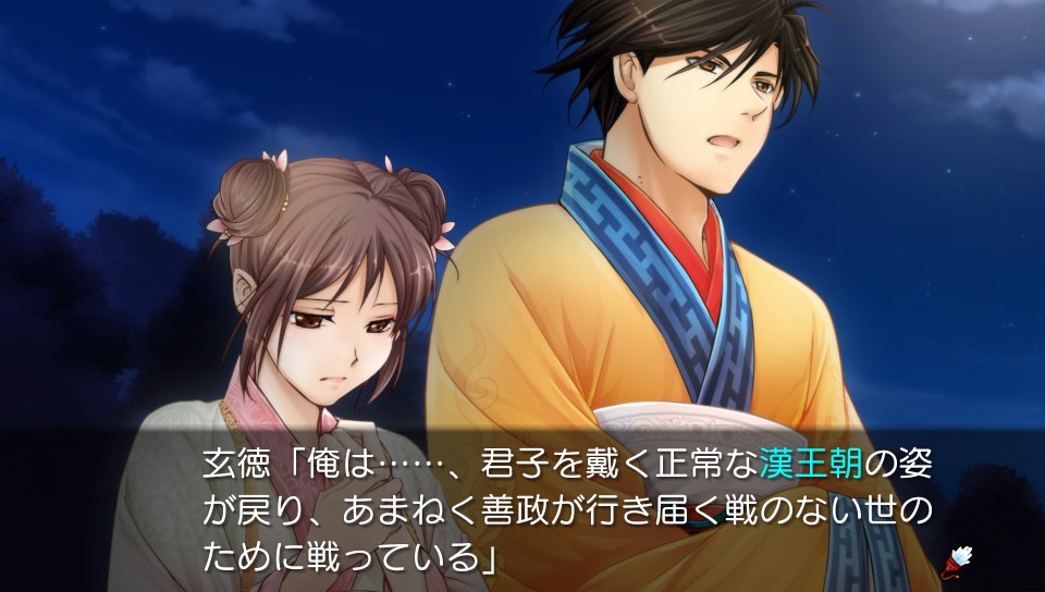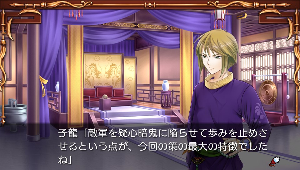 我很喜欢时空穿越的故事,像是闇河魅影.. 而本篇有点类似三国版的梦幻游戏。角色对话间的日文丁寧体、普通体的差别,对我这个日文初学者来说很有帮助。军议可以刺激逻辑统整能力(?),而且在战役时是以多人观点去描述,很有气氛。