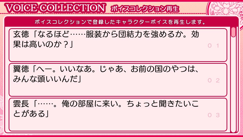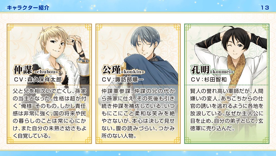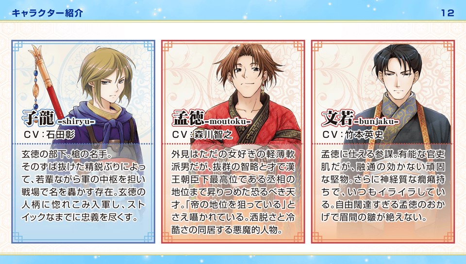 本游戏推荐给想要在PSV上玩女性向文字游戏、或者是对三国歷史有兴趣的玩家,当然,喜欢声优的玩家也可以参考看看,这片3G多的语音可不是说假的。