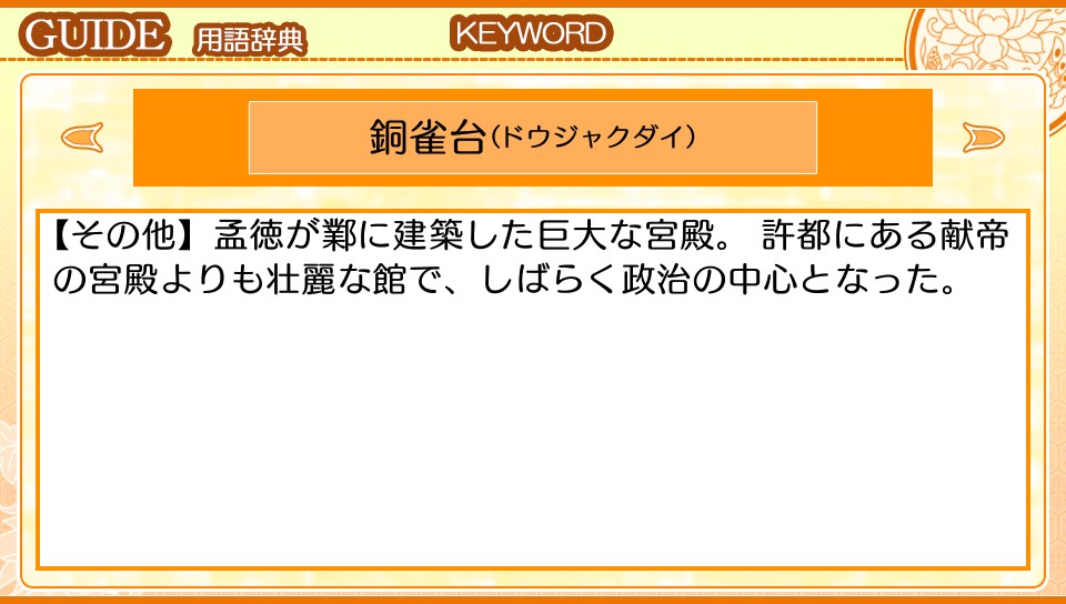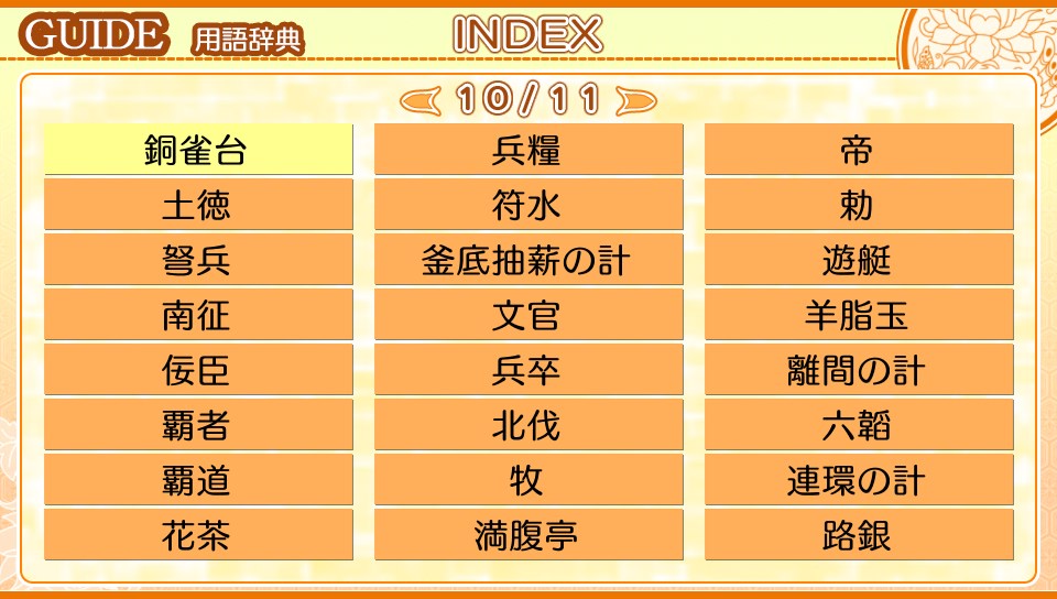 碰触功能便利、Skip的速度非常快,一隻手指头就可以轻鬆的游玩。难度简单,就算选错选项也可以倒转重来,不过这样QS+QR的功能就很少用到..结合史实以及虚构要素的剧本非常有趣,当作歷史复习也可以。因為结合史实所以有丰富的辞典内容,就算没看过三国故事的也可以轻鬆上手。