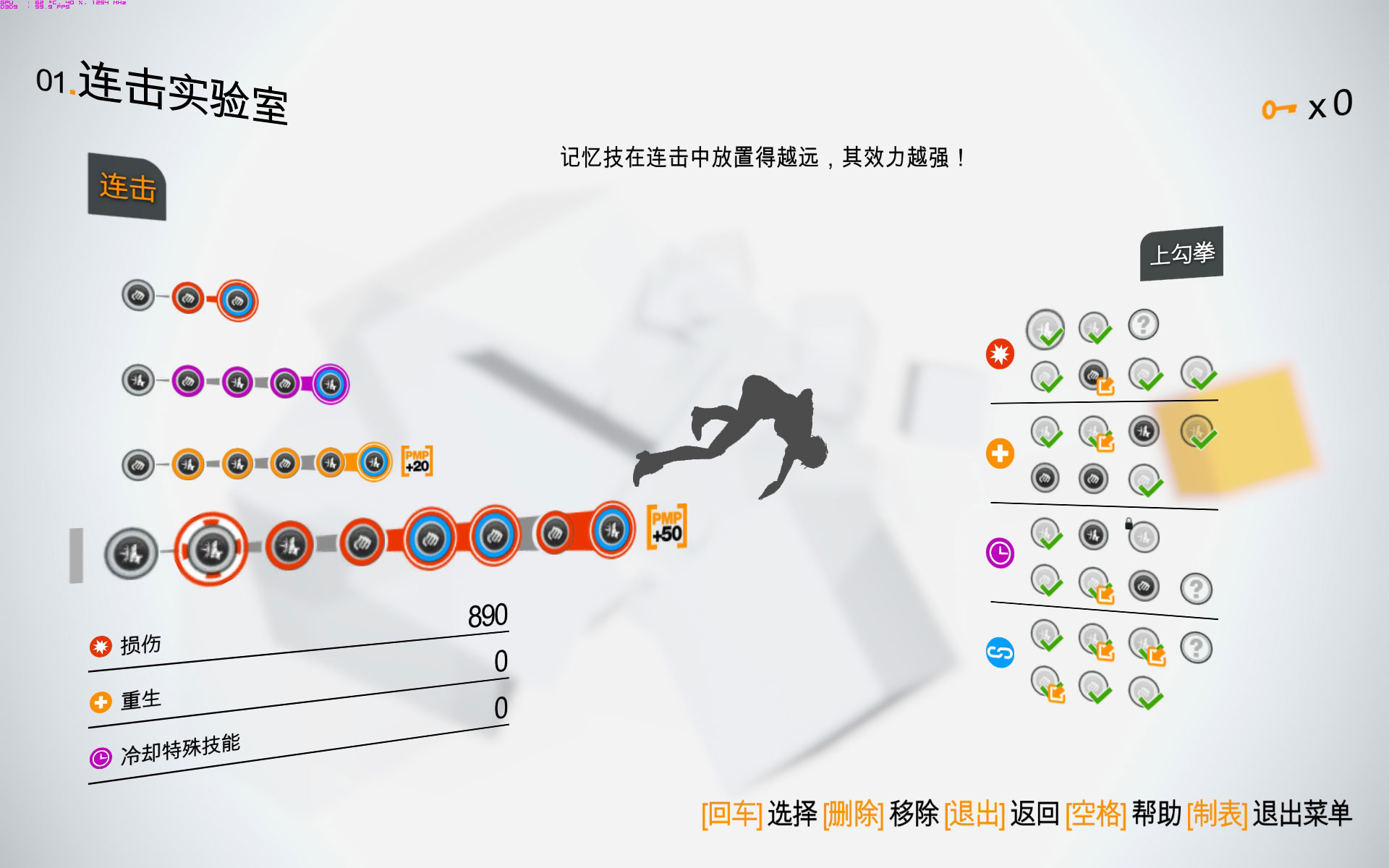 不知道有多少朋友会去仔细去看待各组合拳连技用法,四种类的招式(打击、回技、补血、增强)就是让玩家自由配搭在各情况下使用连技,下面是本人的配搭,有让快速回技的,没血时有一套专门回血,其他都是并最高伤害,你们也可以有自己的一套配法。