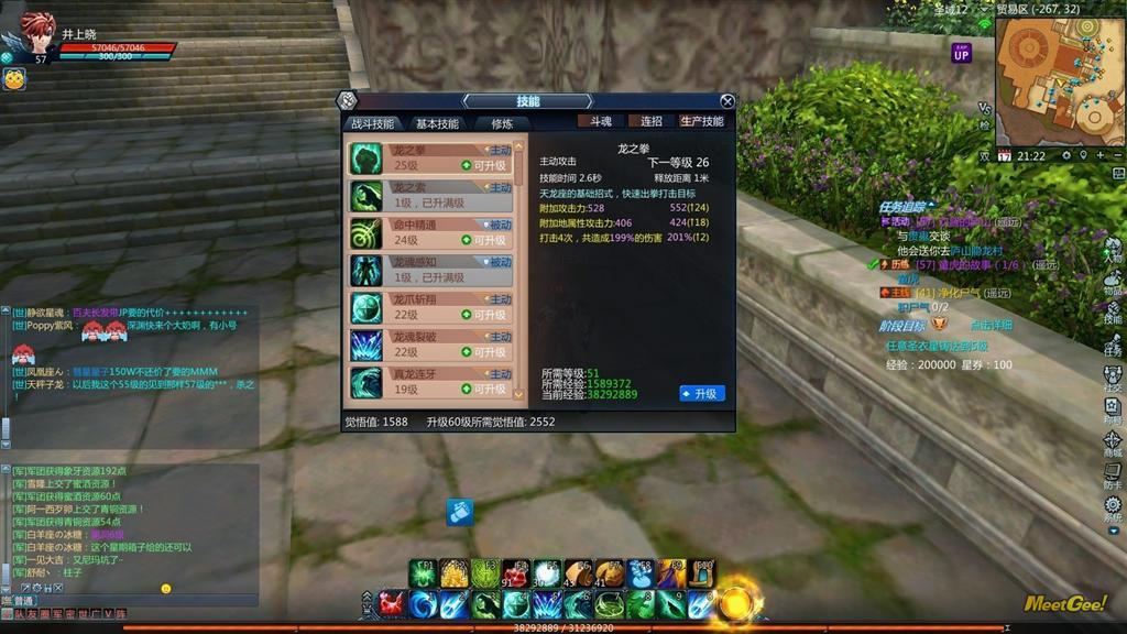 第二是觉悟,觉悟听起来太奇幻、不容易懂,但其实简单的来说就是战斗技能的数量及战斗技能的等级。觉悟占了角色总战斗力的10% 。升级觉悟值需要消耗大量的经验值,这个大量肯定是个消耗经验值的坑,以五十级以上的技能为例,几乎每提升一项战斗技能都需要消耗以百万计的经验,而且战斗力提升的幅度不大,但却不能不提升。因为在游戏中,游戏角色的等级每十级为一个阶段,每提升一个阶段都需要点满该阶的觉悟值,也就是说9 级升10 级需要点满限定的觉悟值,19 升20 级同样需要满足限定的觉悟值,依此类推,只要游戏中的角色升到一定等级,技能等级绝对不会太低,所以打出来的攻击力也不会太少。