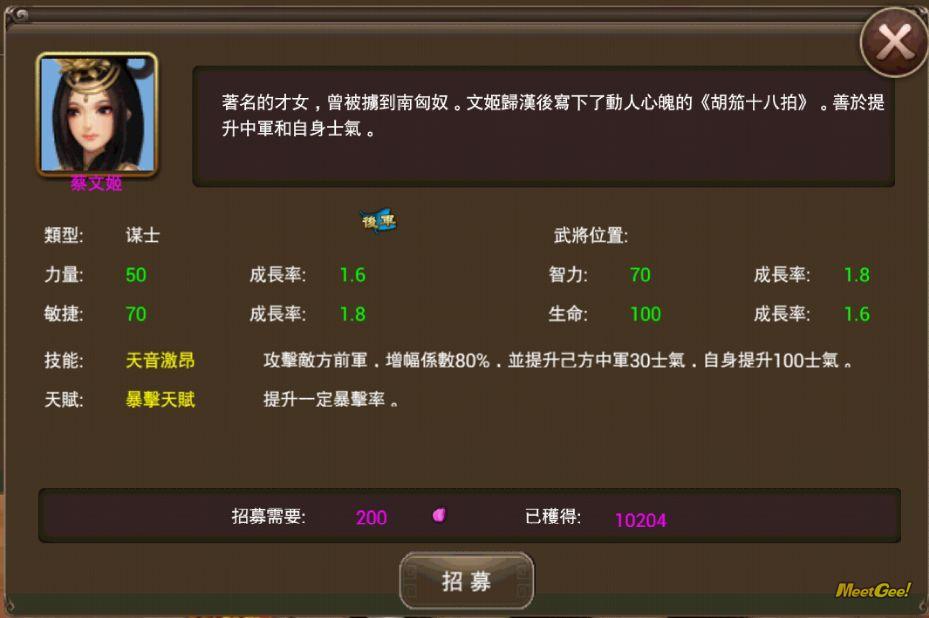 此阶段紫将首选非蔡文姬莫属,虽然做为一个后军在攻击上并无法媲美于中军,但其天音激昂技能所提供的提升我方中军士气,不论是通关、副本、活动或是PVP ,都非常的强大且实用,士气提升意味着武将施放技能的频率更加频繁,变相使阵型的威胁度大幅提升,无论如何,此武将是绝对需要优先取得的。
