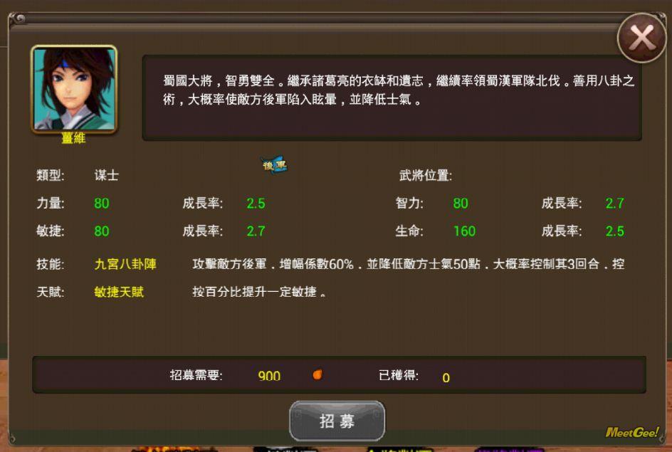 在有了第一只蓝武将后,可以朝取得紫武将的目标发展,若以通关副本为主的玩家建议以周泰为第一目标,其高超的生命与生命成长率与格档天赋,对于初期需要强力肉盾的前军阵型来说非常重要,甚至用到50 级以上都还相当好用,除非再度更换紫色前军武将,不然可是换不掉他的。