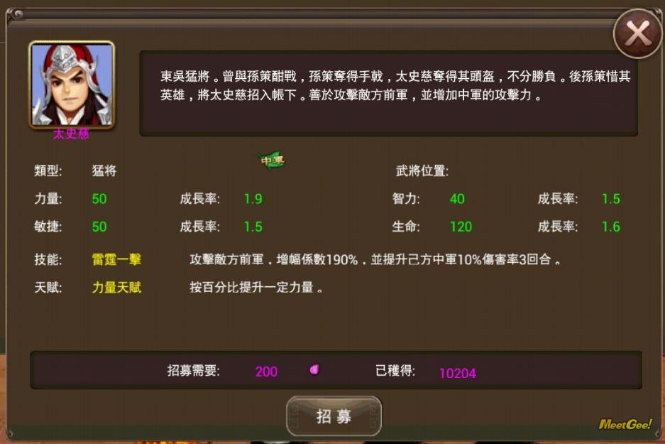 而主攻PVP 的玩家,紫武将建议以太史慈为目标,虽然太史慈没有太亮眼的力量成长,但其技能雷霆一击所带有的伤害与增加中军伤害数回合,是对于强攻阵型非常有帮助的,且玩家主将也属于中军角色,是初中期最能够发挥战力的BUFF 型武将,如果军阶有提高到校尉,更可以一次塞满3 个中军角色发挥BUFF 的最大效益。