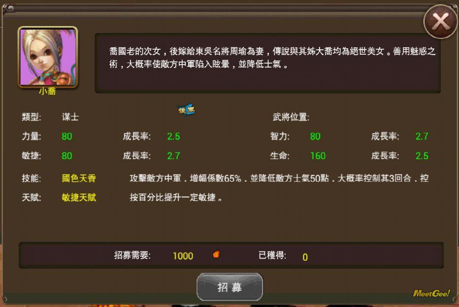 此阶段最强的PVP 武将非小乔和姜维莫属,此两名武将的能力都完全相同,唯一不同的是技能差别,小乔的国色天香可造成敌方中军策略伤害并降低士气,另外还能控制对方数回合,而姜维的能力与小乔相同,差别在于所控制的敌方对象为后军,两者运用程度与控制的对象有所差别,小乔主要是针对敌方的主力输出做控制,而姜维则可以反控制对方的后军,如蔡文姬、小乔、姜维等,直接断绝对方的后路,端看玩家想要走何种策略流派而定。