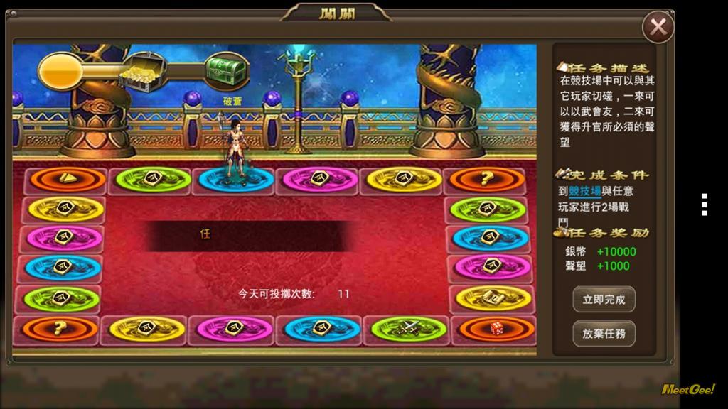 闯关活动是不论中老手都必定会做的项目,他没有任何太困难的门槛,只有需要玩家勤劳去达成的琐碎事件,闯关活动就像大富翁棋盘一样,只要掷出骰子,玩家主将便会走出相应步数,当停留在对应点上后,就会跳出该点的任务内容,任务奖励不外乎经验值、银币、军令和声望,在后期玩家需要更多资源的时候,闯关任务的重要性将会逐渐升高。