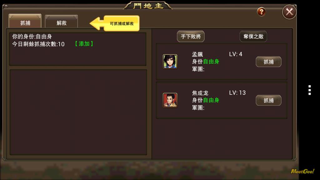 斗地主算是竞技场系统的衍生,只要玩家能够在竞技场中打赢其他玩家,便可以将对方捕抓来获得经验值,赢的对象越多,可抓捕的手下败将就越多!除了捕捉,当然也可以去拯救自己的朋友或是曾经被自己抓捕过的苦工喔。