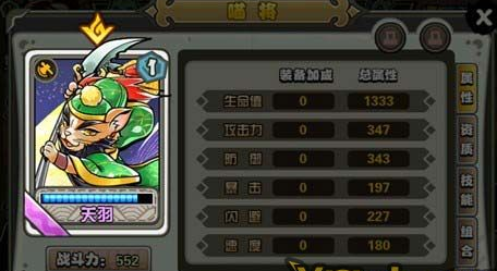 (二)武将的页面上有着:属性、资质、技能、组合四个板块。