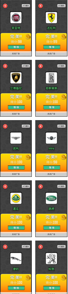 游戏分为9个大的关卡,共有180款的车标等待玩家来挑战。无论你自认为是汽车达人,亦或是刚刚才对汽车感兴趣的准车迷,这部“疯狂猜车”绝对是你的理想伴侣。与此同时,这次全球首发的游戏答案完全都是小编们辛辛苦苦熬夜打出来的,所以还请各位玩家尊重我们的劳动成果。好了,接下来的时间,笔者将以关卡题目的先后顺序为大家把答案一一列举出来。
