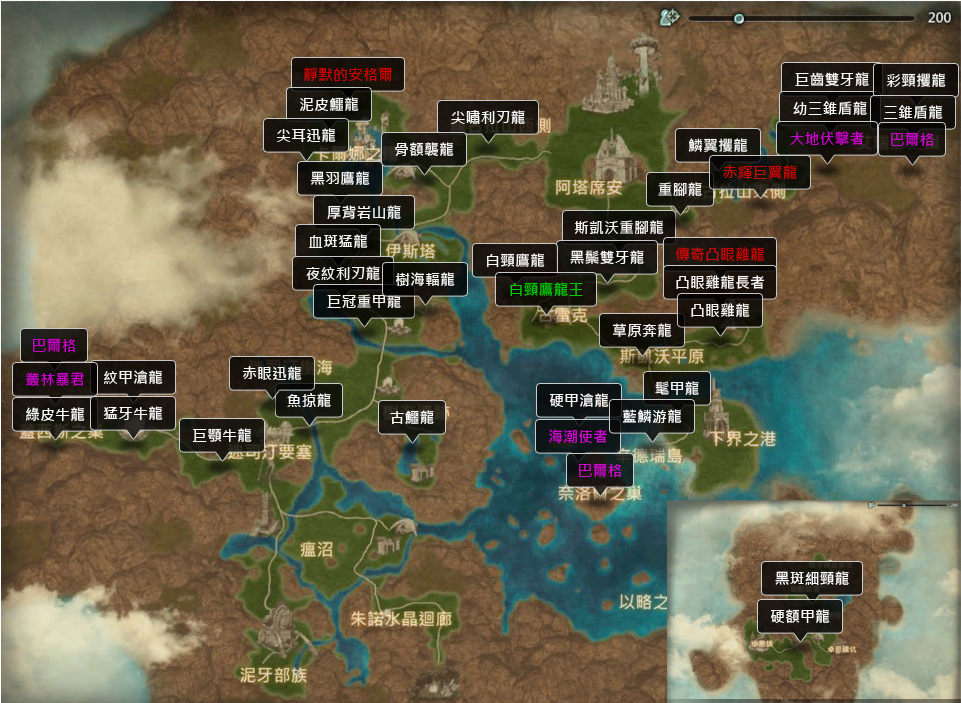 巴尔格(副本稀有龙)、丛林暴君(副本稀有龙)、海潮使者(副本稀有龙)、大地伏击者(副本稀有龙)、静默的安格尔(地图王)、传奇凸眼鸡龙(地图王)、赤辉巨翼龙(地图王)、白颈鹰龙王(公眾王)。