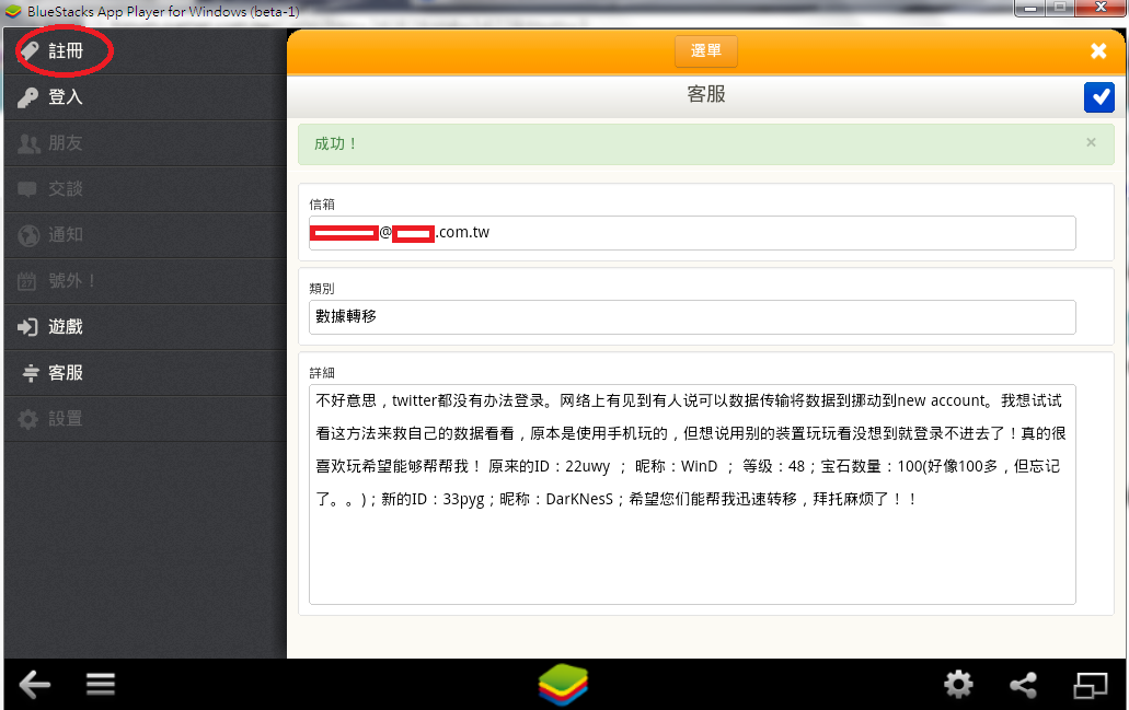 在左上角可以清楚看到我是在登出的状态下寄出去的!在结尾阐述你有多渴望多喜欢玩吧,让他们能够了解并快速解决!当然我后面有打一些,只是我删掉了,肉麻的话自己想吧。而宝石数量大概就好,我记得好像是15x还是17x,不过我重要的是我的数据阿,宝石官方你要的话送你也没差,所以抱著这种心态打100个。打完后右上角的"勾勾"按个1~2次,以保险起见。成功后上面绿绿的会出现成功!!