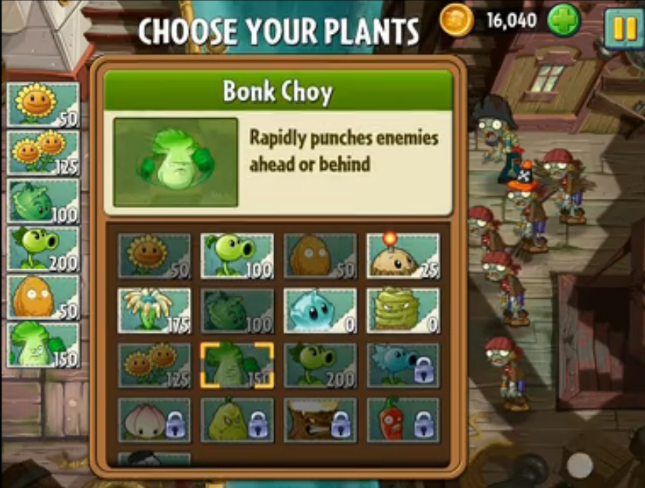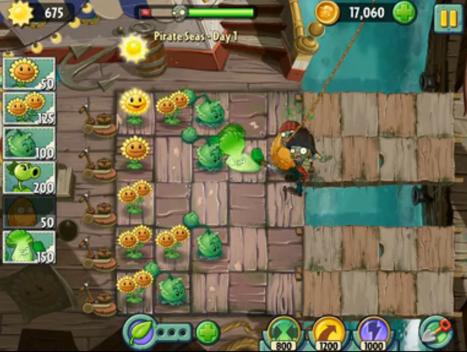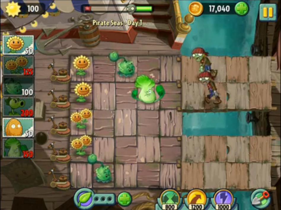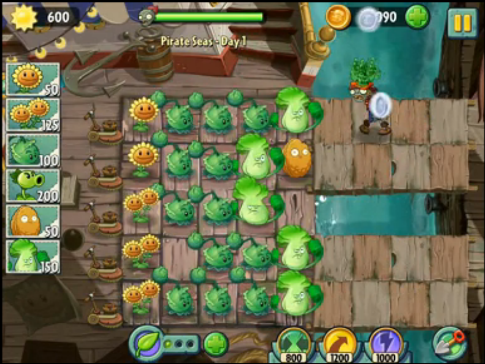 海盗章这第一关除了画面和僵尸的基本装扮有了改变以外,并没有太多的变化,第一关可以根据自己喜好来打,这里选择的植物还是比较保守的。
