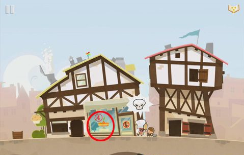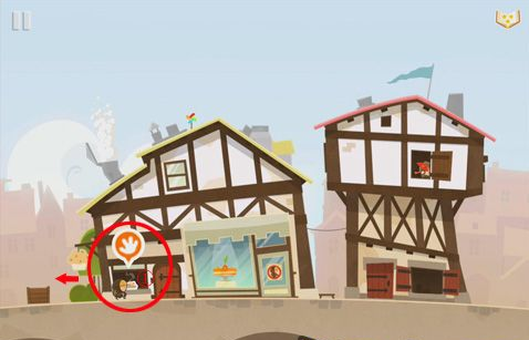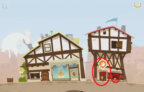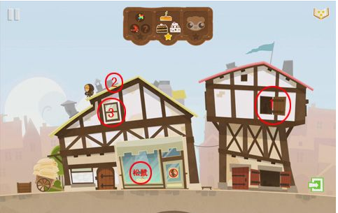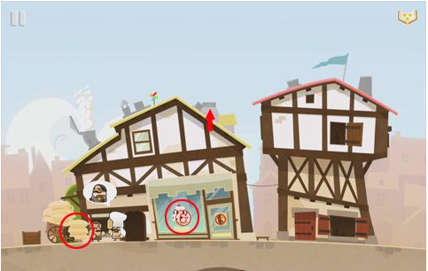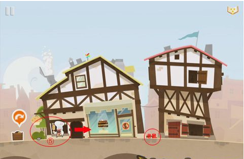 ⑤如图捡起老鼠,放在蛋糕店的窗台,厨师看到之后会追出店去,迅速偷取第二个蛋糕回到木桶。