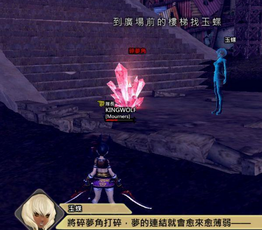 打碎第一个碎梦角上了楼梯后,会发现菖仔在中央,不过得先击碎四周的4 个碎梦角与梦靥蝠,击碎后就可以挑战这第一BOSS ,玩家可以选择击败他或是拯救他,如果成功拯救,还可以达成额外事件,成功击倒BOSS 后,玉蝶会被抓走。