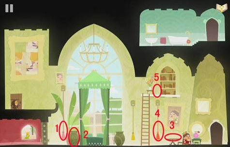 1、游戏的开始我们就下来将①地点的绳子拉开,然后就迅速的躲到②地点的花瓶里,接着这时会出现一个女仆端着水过来同时也会将水放在③地点处,看到女仆出去以后就是我们再抵达③地点处将水得到;再接着拉下④地点处的的绳子爬到高处⑤地点,这时又会进来一个小丑,他会在王后面前表演,我门就可以用刚刚拿的水倒下去,打断小丑的表演,这是小丑表演的道具就会掉在地上。(如下图)